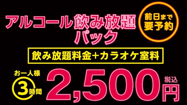飲み放題料金+カラオケ室料3時間で、お一人様2,500円(税込)