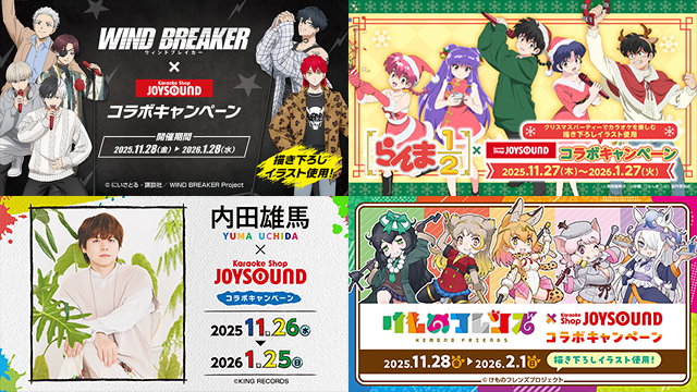 ■TVアニメ『WIND BREAKER』×カラオケショップ JOYSOUNDコラボキャンペーン 全国64店舗のカラオケショップ JOYSOUNDで、オリジナルポストカード付コラボドリンク販売中!JOYSOUND池袋西口公園前店・名駅太閤口店・心斎橋店ではコラボルームのご予約を受付中です♪さらに抽選で30名様にオリジナルアクリルコースターセット(6種)が当たる、スタンプキャンペーンも実施中!