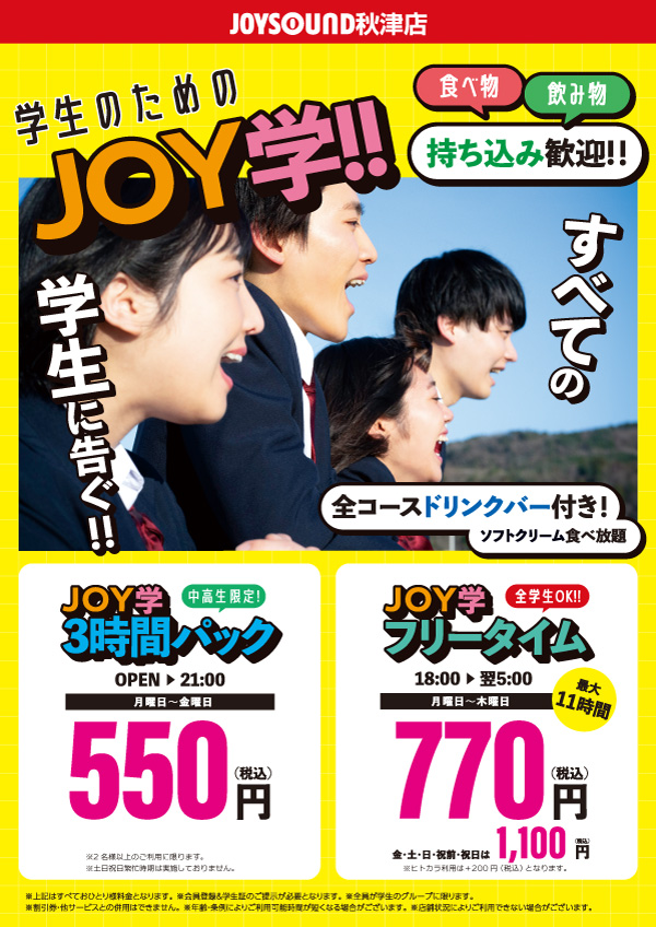 中高生限定3時間パック『JOY学』 11:00~21:00 |