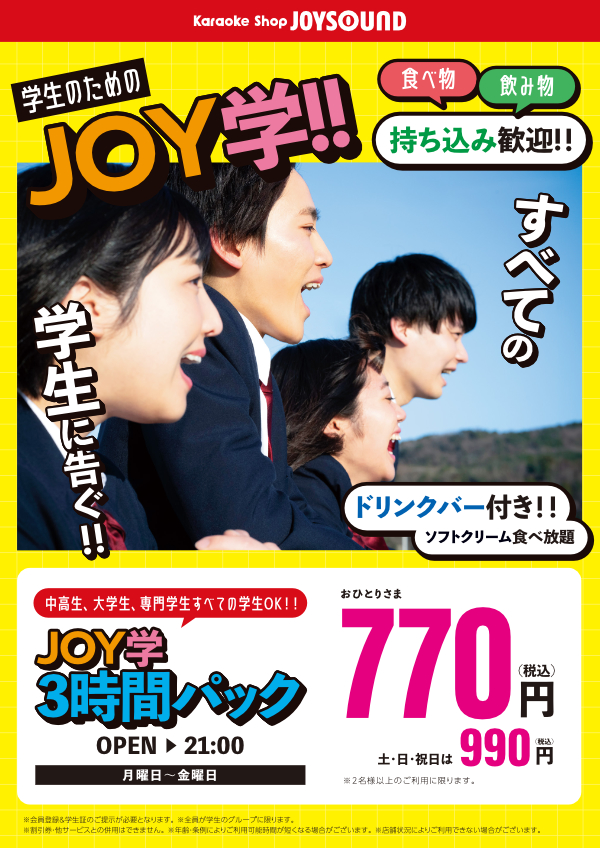 ※学生限定3時間パックは2名様~、OPEN~21:00までの間で最大3時間の利用となります。