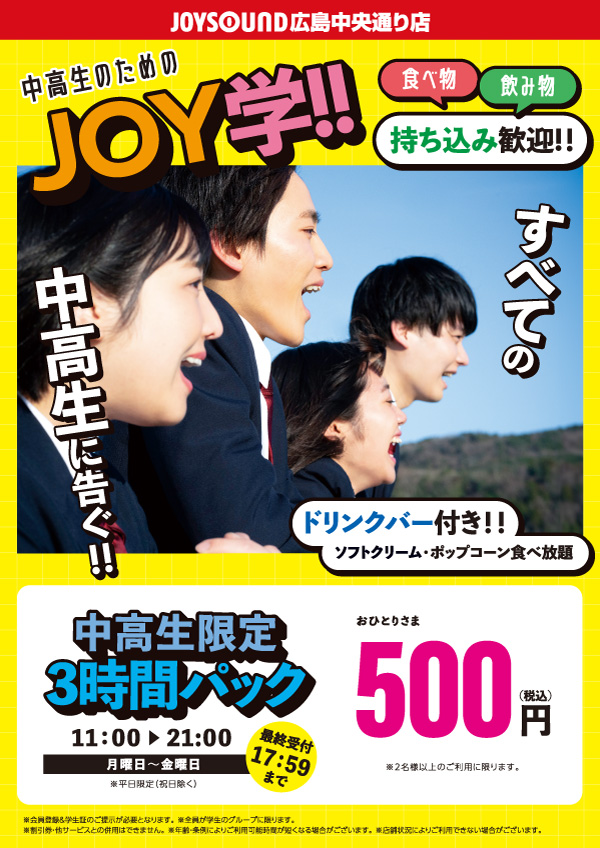 中高生限定3時間パック『JOY学』 11:00~21:00 |