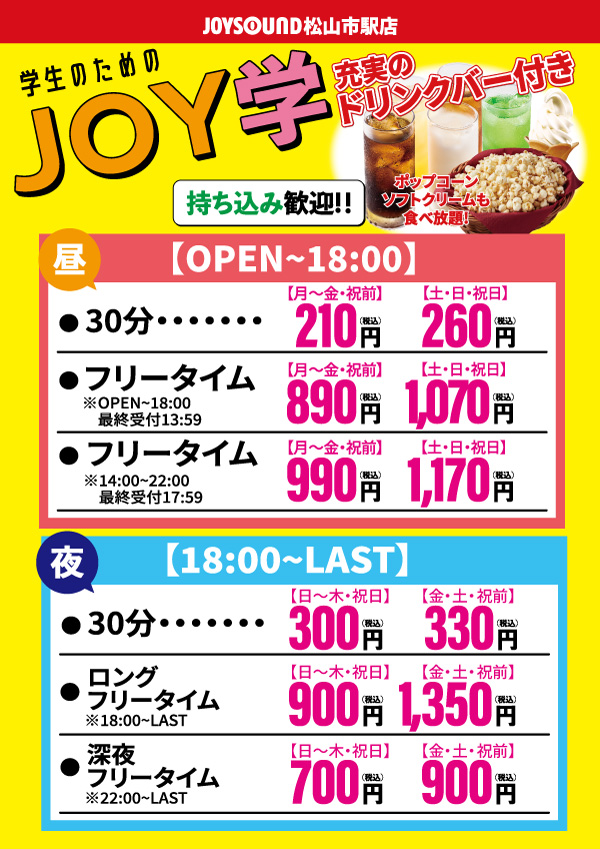 300円 金・土・祝前 330円 ※ドリンクバー付き ※持ち込みOK |