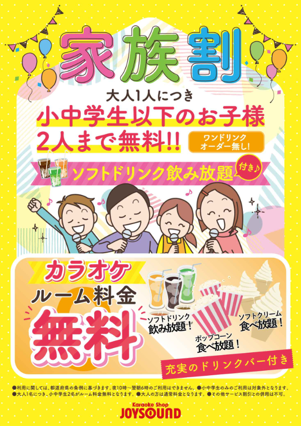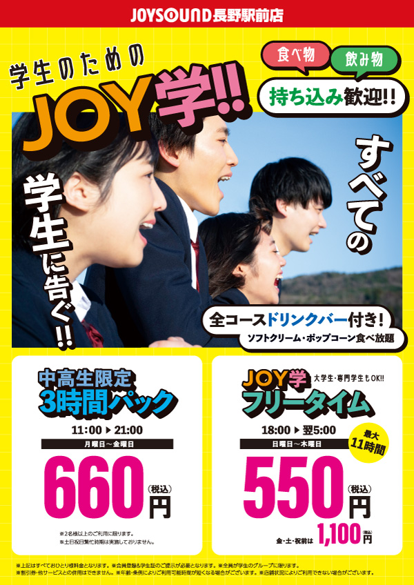 JOY学フリータイム 18:00~翌5:00 | 550円金・土・祝前 1,100円 ※ドリンクバー付き ※持ち込みOK | ー | ー | ー |