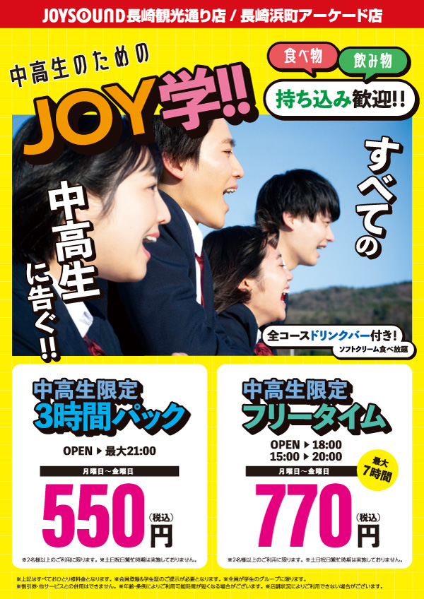 中高生限定3時間パック『JOY学』 10:00~21:00 |