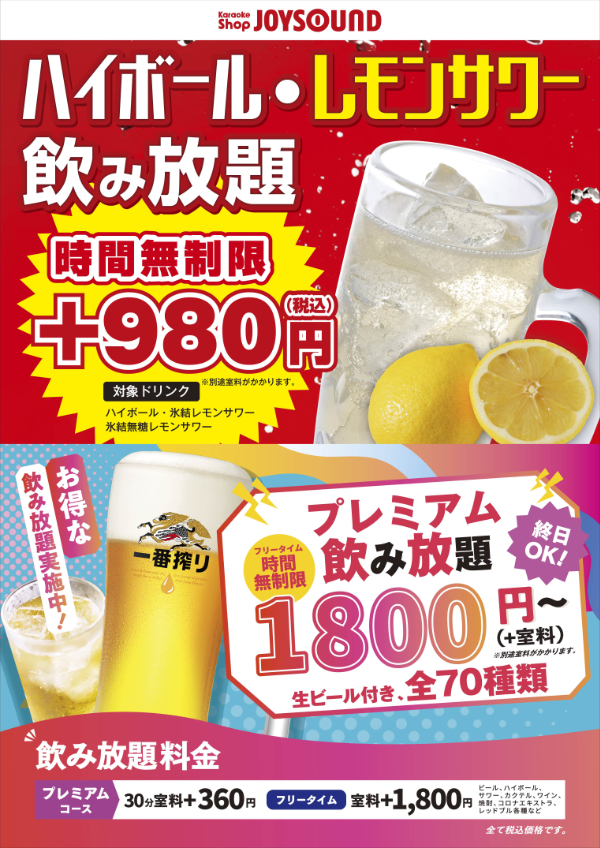 750円 金・土・日・祝・祝前 830円 ※ドリンクバー付き ※持ち込みOK |