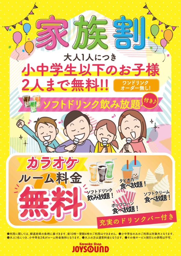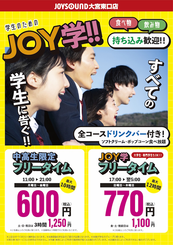 770円 金・土・祝前 1,100円 ※ドリンクバー付き ※持ち込みOK |