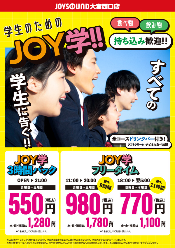 中高生限定3時間パック『JOY学』 11:00~21:00 |