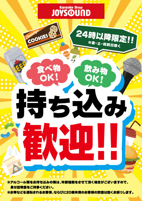 ※金・土・祝前日除く24時以降の入店時、飲食物の持ち込みが可能です。