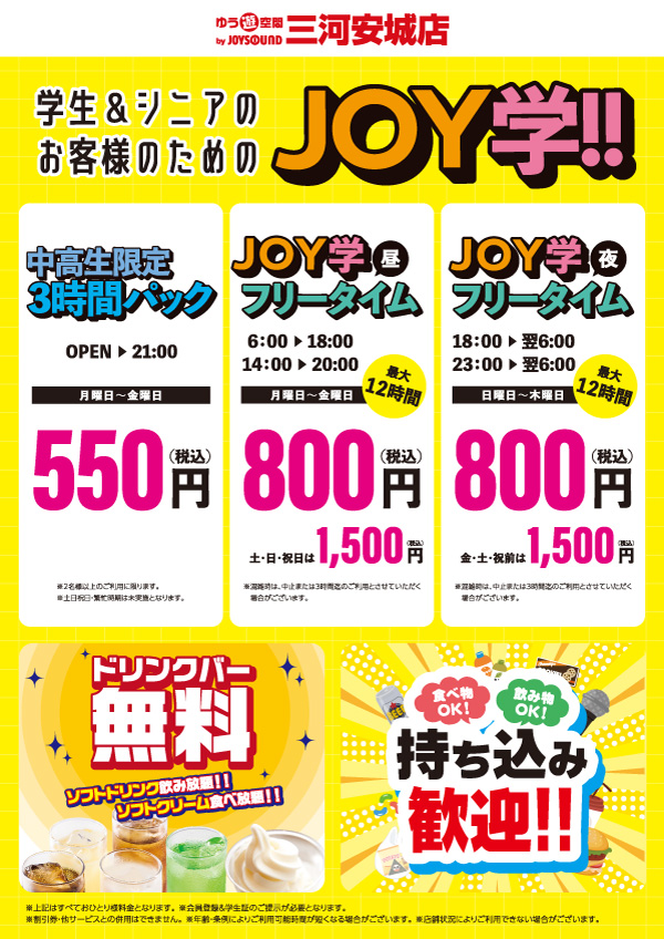 中高生限定3時間パック『JOY学』 6:00~21:00 |